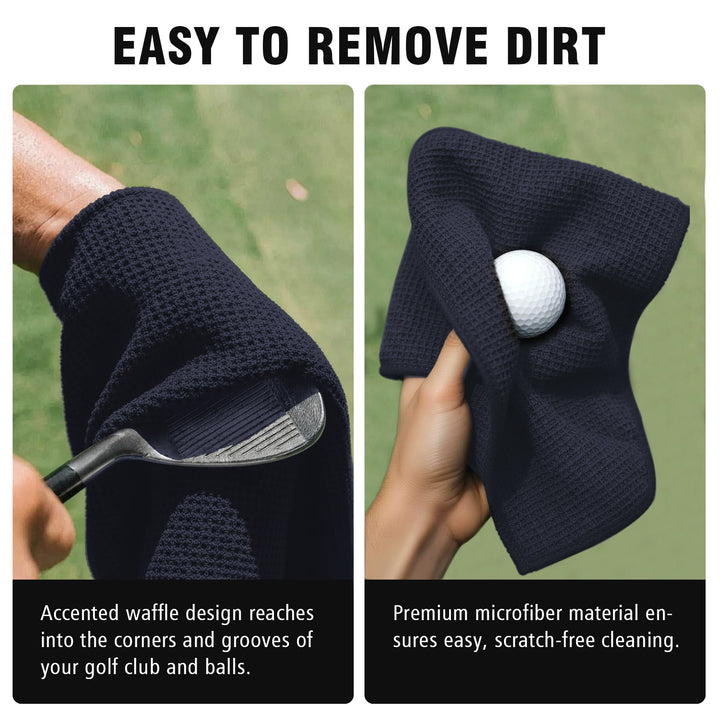 - [ULTRA-SOFT MICROFIBER]Crafted from premium microfiber with a waffle weave design, this towel removes dirt, grass, and sand effectively without scratching your clubs — keeping your gear spotless and game-ready